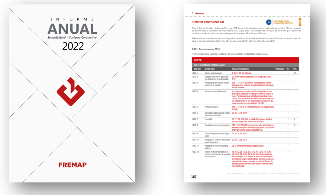La verificación avanzada del índice es un paso adicional que garantiza la calidad y transparencia de la información contenida en el informe anual de FREMAP. La exploración de trazabilidad de la información contenida en el informe, que se realiza durante la verificación conforme a GRI, asegura que la información presentada en el informe es precisa y completa.