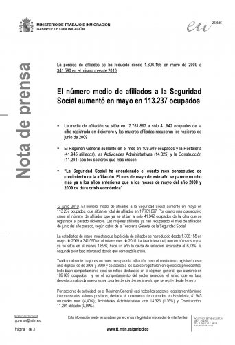 La estadística de mayo muestra que la pérdida de afiliados se ha reducido desde 1.306.155 en mayo de 2009 a 341.590 en el mismo mes de 2010. La tasa interanual, aún en números rojos, ya se sitúa en el menos 1,89%; hace un año la caída de afiliación alcanzaba el 6,73%, la segunda peor tasa interanual desde que comenzó la crisis.
