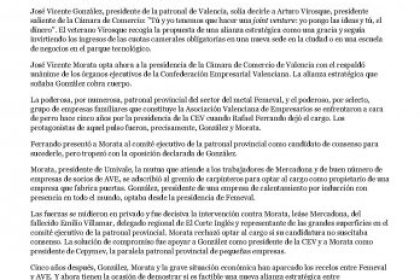 La poderosa, por numerosa, patronal provincial del sector del metal Femeval, y el poderoso, por selecto, grupo de empresas familiares que constituye la Asociacion Valenciana de Empresarios se enfrentaron a cara de perro hace cinco anos por la presidencia de la CEV cuando Rafael Ferrando dejo el cargo. Los protagonistas de aquel pulso fueron, precisamente, Gonzalez y Morata.