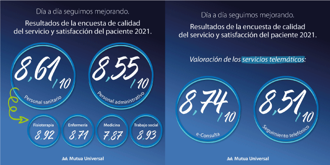 Mutua Universal, mutua colaboradora con la Seguridad Social, ha obtenido una valoración global de 7,75 puntos sobre 10 en la Encuesta de Satisfacción Paciente correspondiente al año 2021. Este resultado supone un ligero incremento respecto de la edición anterior de la encuesta, llevada a cabo en 2019 y en la que obtuvo 7,72 puntos.