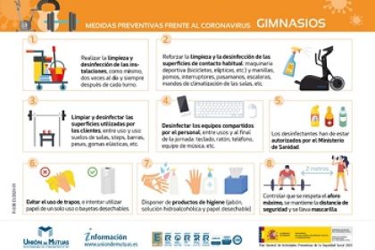 Con este objetivo, Unión de Mutuas, ha elaborado unas fichas con consejos y pautas a tener en cuenta en el interior de los gimnasios en los que la ventilación, la mascarilla, la higiene, la distancia social, y el aforo reducido son claves para minimizar los riesgos.