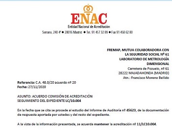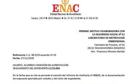 Dotado de los equipos más utilizados en la industrial actual, el laboratorio de Metrología Dimensional de FREMAP, acaba recibir de la Entidad Nacional de Acreditación – ENAC – la renovación de la acredi-tación número 11/LC10.004, una vez la Comisión de Acreditación de dicha entidad estudió el informe de la auditoria del pasado mes de septiembre. Esta acreditación se mantiene hasta el mes de abril de 2022.