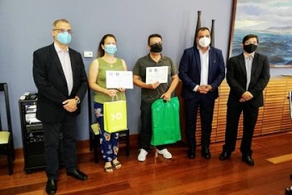 Ana Tejera Aquiar y Emilio Joaquín Hernández Couto, ganadora y segundo clasificado, respectivamente, del II Concurso de microrrelatos sobre Prevención de Riesgos Laborales (PRL) organizado por la Mutua de Accidentes de Canarias (MAC), recibieron hoy de manos del director-gerente de la Mutua, Javier González Ortiz, y de los representantes de las empresas colaboradoras, el director insular de Transportes, José Alberto León, en representación de TITSA, así como del CEO de Ossaforma, Carlos García, los premios que les acreditan como vencedores de este concurso que MAC organiza por segundo año consecutivo. “Jinete de alturas” es el título del trabajo ganador, que fue elegido por un jurado compuesto por miembros de la Comisión de RSC de MAC. El segundo premio fue para el relato “Estaba segura”.