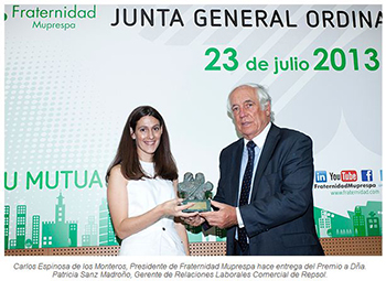 D. Carlos Espinosa de los Monteros, presidente de Fraternidad Muprespa, ha sido el encargado de entregar el premio a D Patricia Sanz Madrono, Gerente de Relaciones Laborales Comercial de Repsol.