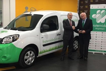 El director Gerente de la Mutua, Carlos Aranda, ha recogido las llaves del vehículo personalizado Renault Kangoo Z.E., de manos del director de la concesión Renault Jurado, Víctor Martín. También han estado presentes en el acto Belen Sierra, directora del departamento de Compras y Servicios, y Antonio Sojo, jefe de área de Servicios Generales.
