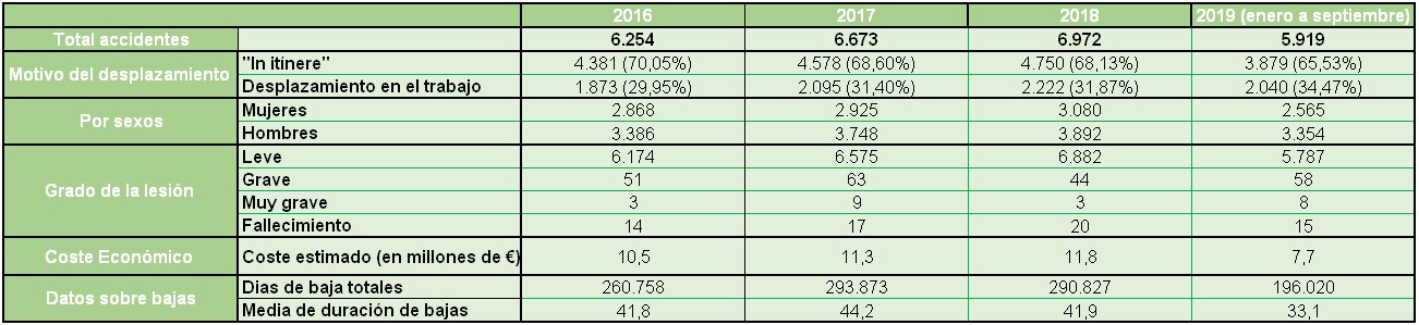 Los datos de siniestralidad vial laboral de Fraternidad-Muprespa, como se detalla en la tabla, muestran que el total de accidentes ocurridos desde el 1 de enero de 2016 y el 30 de septiembre de 2019 se acerca a los 26.000 y que 66 trabajadores protegidos perdieron la vida en ellos.