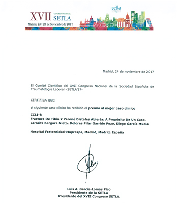 El caso fue presentado por la doctora Larraitz Bergara Nieto, medico residente de Traumatologia y Cirugia Ortopedica de segundo ano en el Hospital Central de la Mutua, con la aportacion de los doctores, Dolores Pilar Garrido Pozo, Miguel Ortega de Santiago, Raul Zapata Rodrigo y Diego Garcia Muela.