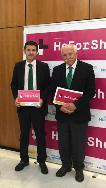 Posteriormente Carlos Aranda y Manuel Porrua, director del centro de Recursos Humanos y RSC han ratificado la adhesion de Fraternidad-Muprespa a la campana HeforShe, impulsada por ONU Mujeres que implica a hombres y ninos en la eliminacion de las barreras sociales y culturales que impiden la plena igualdad.