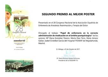 El equipo de la URPA del Hospital FREMAP de Majadahonda ha obtenido el segundo premio al mejor póster presentado en el 28 Congreso Nacional de la Sociedad Española de Enfermería en Anestesiología-Reanimación y Terapia del Dolor celebrado en Málaga con un trabajo sobre el "Papel de enfermería en la correcta administración de medicación en el ámbito postquirúrgico".