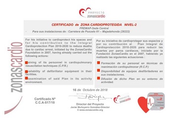 FREMAP ha recibido de la Fundación ZonasCardio el correspondiente Certificado de Zona Cardioprotegida para sus instalaciones en FREMAP- Sede Central, por su iniciativa en cardioproteger sus espacios y contribuir al Plan Integral de Cardioprotección 2010- 2020.