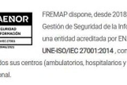 El certificado, otorgado tras la auditoria realizada por AENOR, acredita que FREMAP tiene implantado un conjunto de controles adecuados para asegurar la confidencialidad, integridad y disponibilidad de su sistema de informacion y datos de sus grupos de interes, cubriendo todas las actividades y centros de la Mutua.