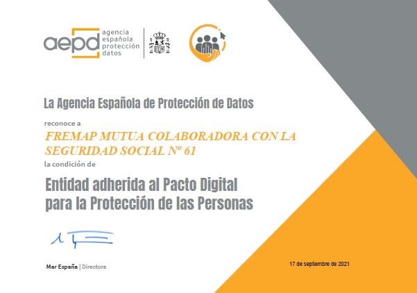 Mediante la adhesión al PACTO DIGITAL, FREMAP se compromete a implantar los principios y recomendaciones recogidas en el mismo, así como a difundir entre su personal trabajador y las personas usuarias el Canal prioritario para solicitar la eliminación urgente de contenidos sexuales y violentos en internet, así como otros recursos y herramientas para ayudar a la concienciar sobre el valor de la privacidad y la importancia del tratamiento de los datos personales.