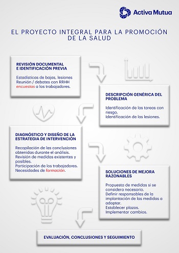 El proyecto integral para la promoción de la salud en Fundación Pere Mata se inicia en un ámbito reducido para conseguir la aplicación de medidas a corto y medio plazo. Posteriormente, se amplía de manera gradual esta intervención. Todo en concomitancia con las áreas de recursos humanos y prevención de riesgos laborales de esta empresa. El proceso incluye encuestas anónimas a los trabajadores, actividades de observación en el ambiente laboral para comprobar in situ cuáles son los hábitos posturales (shadowing). Una vez recopilados los datos y establecidas las conclusiones, se organizarán jornadas de sensibilización para la promoción y mejora de la salud de los trabajadores.