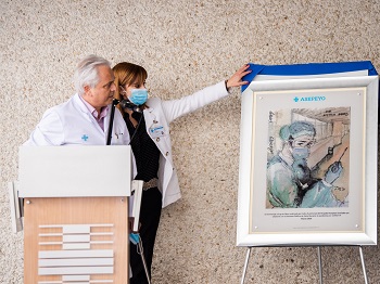 En homenaje a la gran labor sanitaria realizada por todo el personal, el Hospital ha celebrado hoy un acto en el que se ha descubierto una placa que conmemora la llegada de pacientes Covid-19 al centro. En el evento han estado presentes Isabel García Gismera, subdirectora general de Asistencia Sanitaria de la Mutua, y todo el equipo directivo del Hospital.