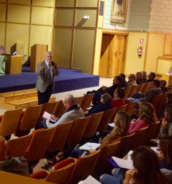 El subdirector de Operaciones de MAC, Octavio Calderin, explica los riesgos psicosociales a los que se enfrentan los docentes en el desempeno de su trabajo. El Aula Magna de la Universidad de La Laguna acogio esta jornada auspiciada por la Consejeria de Educacion y Universidades del Gobierno de Canarias.