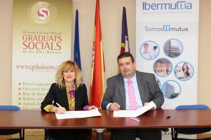 El convenio ha sido suscrito hoy en la sede del Colegio por Apol·lònia Mª Julià Andreu, presidenta del Colegio Oficial de Graduados Sociales de les Illes Balears, y Eduardo Zurdo Palacios, director de Ibermutua en Islas Baleares.