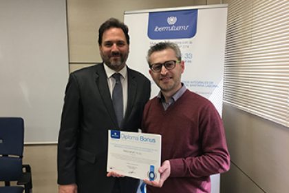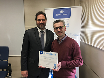 La entrega de los diplomas se llevo a cabo en un acto organizado por la mutua en el centro asistencial y administrativo que la entidad tiene en la localidad madrilena de Pinto, el tambien sirvio de escenario para celebrar una sesion informativa sobre el sistema de incentivo Bonus., en la que intervinieron Juan Carlos Sanchez Perez, director de Zona de Relacion con Mutualistas de Ibermutuamur en Madrid Sur, Toledo y Extremadura, Efren Fernandez Pulido, tecnico de Prevencion de Ibermutuamur en Zona Centro, y Leticia Espinosa Gonzalez, trabajadora social en Servicios Centrales de Ibermutuamur.
