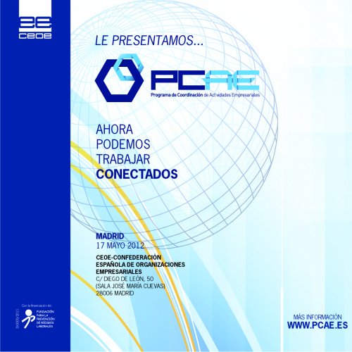 El proximo 17 de mayo tendra lugar la Jornada de presentacion del Programa de Coordinacion de Actividades Empresariales (PCAE) dirigida a las Mutuas de Accidentes de Trabajo y Enfermedades Profesionales de la Seguridad Social y Servicios de Prevencion Ajeno. Dicha Jornada se inscribe dentro de la Accion Directa 0005/2011 solicitada por la Confederacion Espanola de Organizaciones Empresariales (CEOE), que cuenta con la financiacion de la Fundacion para la Prevencion de Riesgos Laborales.