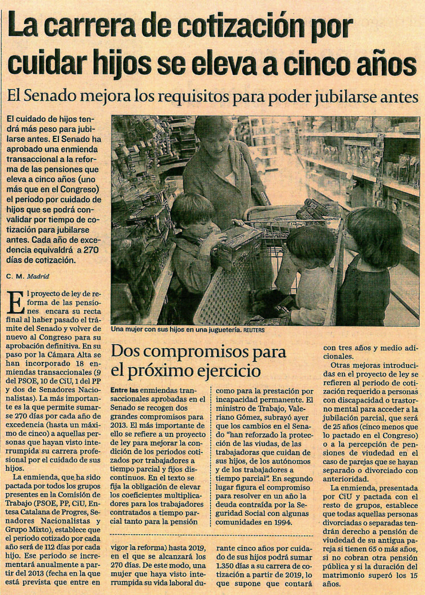 La carrera de cotizacion por cuidar hijos se eleva a cinco anos.