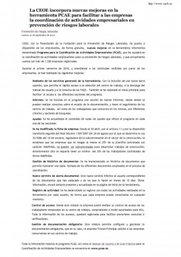 CEOE, con la financiación de la Fundación para la Prevención de Riesgos Laborales, ha puesto a disposición de los empresarios, de forma gratuita, nuevas mejoras en la herramienta informática denominada Programa para la Coordinación de Actividades Empresariales (PCAE), que les ayudará en la coordinación de actividades empresariales para la prevención de riesgos laborales, y que actualmente cuenta con más de 1.300 empresas registradas.