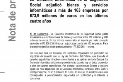 Del volumen total de licitación, los contratos negociados sin publicidad se adjudican de acuerdo con la Ley de Contratos del Estado, que traslada al derecho español las directivas comunitarias y se aplican en toda Europa. La Gerencia Informática utiliza este procedimiento cuando hay un único proveedor o bien por razones tecnológicas. Por ejemplo, las empresas Selesta y Nesspro Spain se han adjudicado de la Gerencia Informática contratos entre 2006 y 2009 por importe de 21,5 millones de euros, de los que 13,4 millones de euros corresponden a procedimientos negociados sin publicidad y 8 millones a concursos.