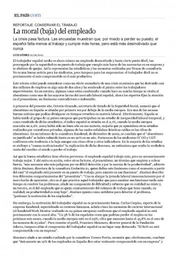 Sin embargo, la motivación del trabajador español no es precisamente buena. Carlos Carpiso, experto de la empresa Randstad, especializada en recursos humanos, señala cómo las encuestas de carácter internacional (el Randstad Work Monitor realizado en 24 países europeos) confirman que el empleado español no está precisamente con la moral alta: "Un 38 % de los españoles creen que podrían perder el empleo en los próximos seis meses, cuando la media europea está en el 29%, cifra que aumenta hasta el 45,8% en el caso de los menores de 25 años". Para rematar el perfil, Francisco Mesonero, director general de la Fundación Adecco, tampoco sitúa el compromiso del trabajador español en un lugar muy destacado: "El 80% no está comprometido con su empresa".