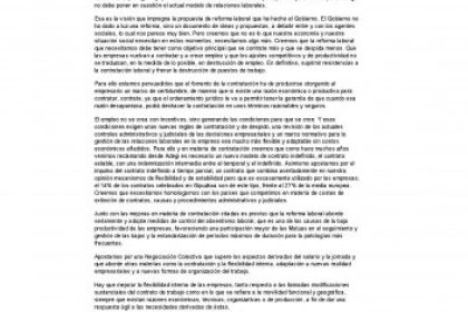 Esa es la visión que impregna la propuesta de reforma laboral que ha hecho el Gobierno. El Gobierno no ha dado a luz una reforma, sino un documento de ideas y propuestas, a debatir entre y con los agentes sociales, lo cual nos parece muy bien. Pero creemos que no es lo que nuestra economía y nuestra situación social necesitan en estos momentos, necesitamos algo más. Creemos que la reforma laboral que necesitamos debe tener como objetivo principal que se contrate más y que se despida menos. Que las empresas vuelvan a contratar y a crear empleo y que los ajustes competitivos y de productividad no se traduzcan, en la medida de lo posible, en destrucción de empleo. En definitiva, suprimir resistencias a la contratación laboral y frenar la destrucción de puestos de trabajo.