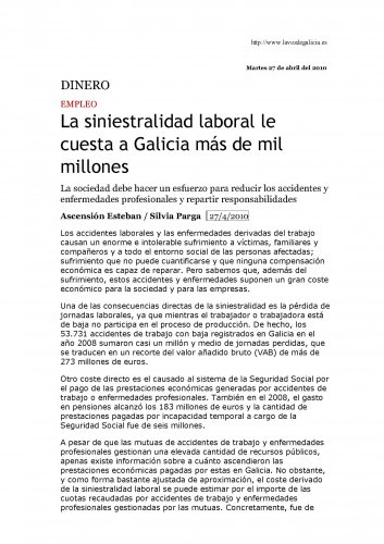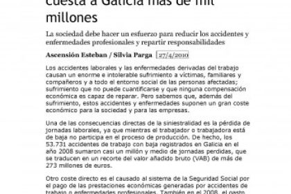 Una de las consecuencias directas de la siniestralidad es la pérdida de jornadas laborales, ya que mientras el trabajador o trabajadora está de baja no participa en el proceso de producción. De hecho, los 53.731 accidentes de trabajo con baja registrados en Galicia en el año 2008 sumaron casi un millón y medio de jornadas perdidas, que se traducen en un recorte del valor añadido bruto (VAB) de más de 273 millones de euros.