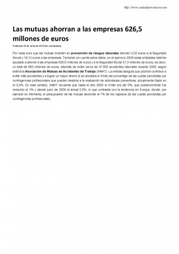 Por cada euro que las mutuas invierten en prevención de riesgos laborales ahorran 2,02 euros a la Seguridad Social y 18,12 euros a las empresas. Teniendo en cuenta estos datos, en el ejercicio 2009 estas entidades habrían ayudado a ahorrar a las empresas 626,5 millones de euros y a la Seguridad Social 37,3 millones de euros, es decir, un total de 663 millones de euros, además de evitar cerca de 47.000 accidentes laborales durante 2009, según estima la Asociación de Mutuas de Accidentes de Trabajo (AMAT). La entidad asegura que podrían contribuir a evitar más accidentes y a lograr un mayor ahorro si se ampliara el límite del porcentaje de las cuotas percibidas por contingencias profesionales que pueden destinar a la realización de actividades preventivas, actualmente fijado en el 0,5%. En este sentido, AMAT recuerda que hasta el año 2005 el límite era del 5%, que posteriormente fue reducido al 1% y desde junio de 2009 al actual 0,5%; lo que contrasta con la tendencia en Europa, donde, por ejemplo en Alemania, el presupuesto de las mutuas asciende al 7% de los ingresos de las cuotas percibidas por contingencias profesionales.