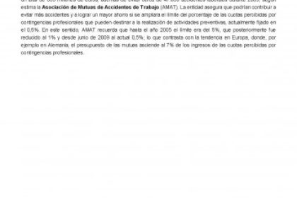Por cada euro que las mutuas invierten en prevención de riesgos laborales ahorran 2,02 euros a la Seguridad Social y 18,12 euros a las empresas. Teniendo en cuenta estos datos, en el ejercicio 2009 estas entidades habrían ayudado a ahorrar a las empresas 626,5 millones de euros y a la Seguridad Social 37,3 millones de euros, es decir, un total de 663 millones de euros, además de evitar cerca de 47.000 accidentes laborales durante 2009, según estima la Asociación de Mutuas de Accidentes de Trabajo (AMAT). La entidad asegura que podrían contribuir a evitar más accidentes y a lograr un mayor ahorro si se ampliara el límite del porcentaje de las cuotas percibidas por contingencias profesionales que pueden destinar a la realización de actividades preventivas, actualmente fijado en el 0,5%. En este sentido, AMAT recuerda que hasta el año 2005 el límite era del 5%, que posteriormente fue reducido al 1% y desde junio de 2009 al actual 0,5%; lo que contrasta con la tendencia en Europa, donde, por ejemplo en Alemania, el presupuesto de las mutuas asciende al 7% de los ingresos de las cuotas percibidas por contingencias profesionales.