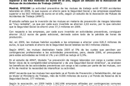 La actividad preventiva de las mutuas de trabajo evitó 47.000 accidentes laborales en 2009, lo que supuso un ahorro para la Seguridad Social y las empresas españolas superior a los 663 millones de euros en el año, según un estudio de la Asociación de Mutuas de Accidentes de Trabajo (AMAT).
