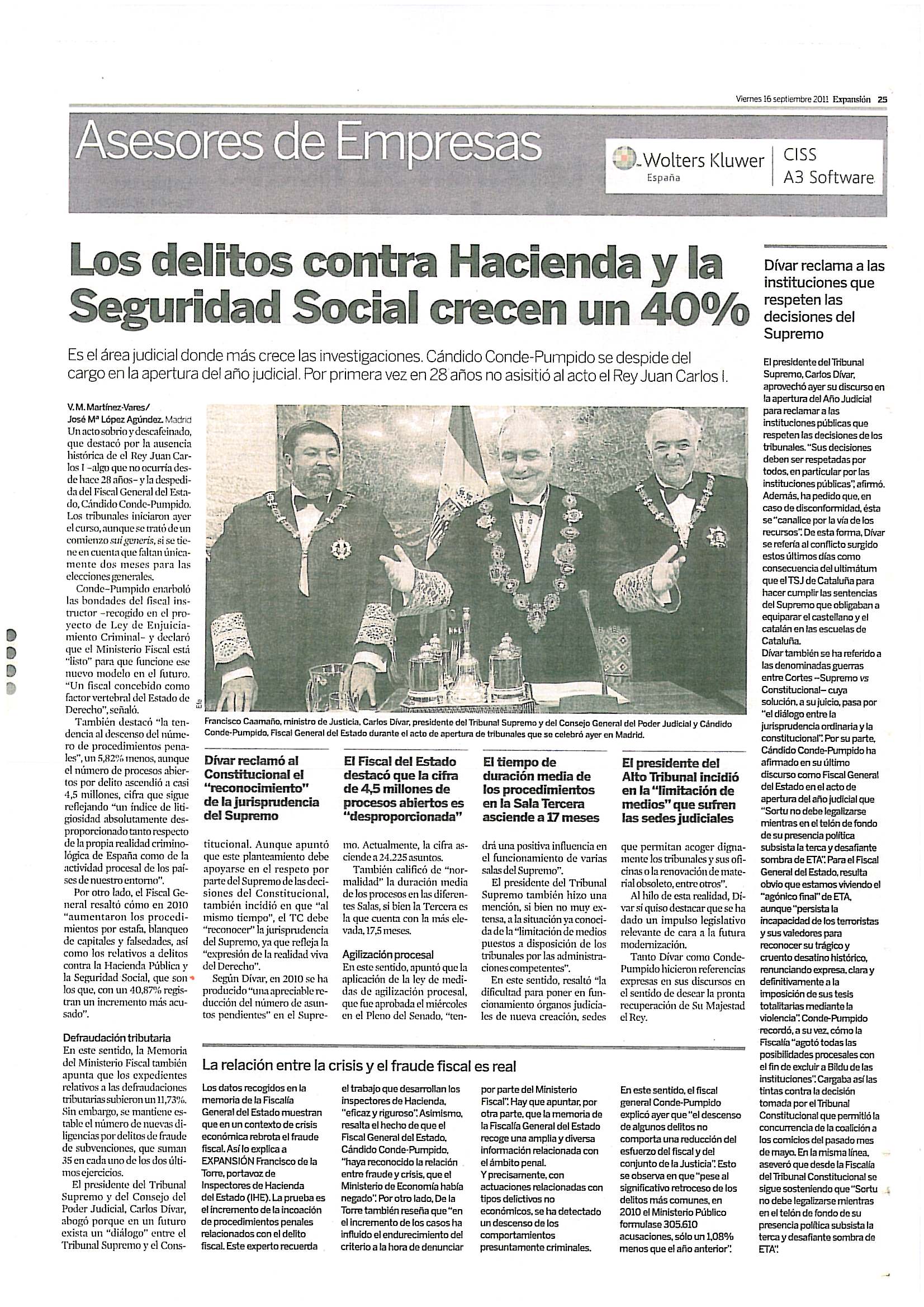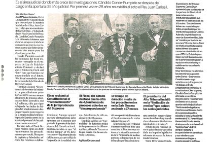 Es el area judicial donde mas crece las investigaciones. Candido Conde-Pumpido se despide del cargo en la apertura del ano judicial. Por primera vez en 28 anos no asistio al acto el Rey Juan Carlos I.