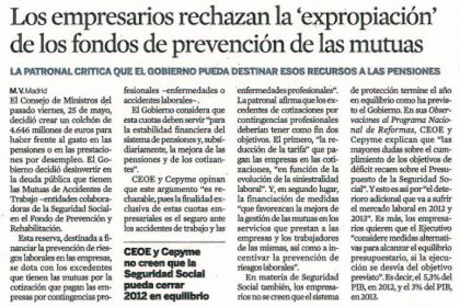 • Los empresarios rechazan la -expropiacion- de los fondos de prevencion de las mutuas.