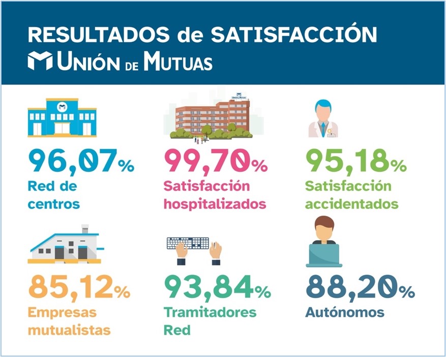 - En 2023, el Instituto de Traumatología Unión de Mutuas, centro hospitalario propio de la mutua, ha alcanzado un índice de satisfacción del 99,70% entre sus pacientes.