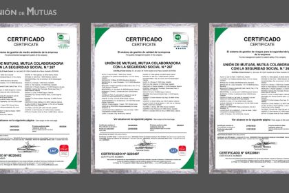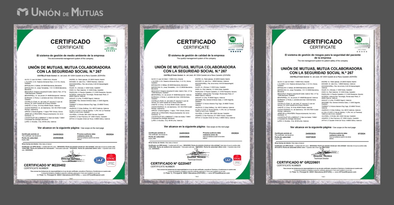Unión de Mutuas mantiene su compromiso constante y decidido con la calidad del servicio como elemento clave que le permite renovar los certificados de calidad conforme la ISO 9001 de calidad, ISO 14001 de medioambiente y UNE 179003 de seguridad de pacientes.