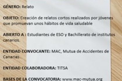 En el certamen de microrrelatos, que deben tener una extensión no superior a las 150 palabras y no inferior a las 50, pueden participar todas aquellas personas que lo deseen y residan en Canarias. La fecha límite para enviar los trabajos es el 6 de mayo y el correo electrónico al que deben remitirse es dptocomunicacion@mac-mutua.org. Las bases de esta convocatoria pueden consultarse también en la web de MAC.