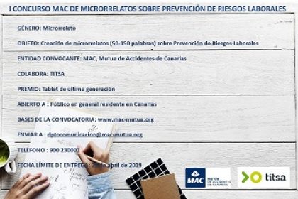 La Mutua de Accidentes de Canarias (MAC), con el apoyo de la empresa de Transportes Interurbanos de Tenerife, SA (TITSA), lanza su primer concurso de microrrelatos sobre Prevención de Riesgos Laborales. Esta acción se une a la ya puesta en marcha hace dos semanas y que este año alcanza su segunda edición: el concurso de relatos cortos sobre hábitos saludables, dirigido a estudiantes de ESO y Bachiller de Canarias.