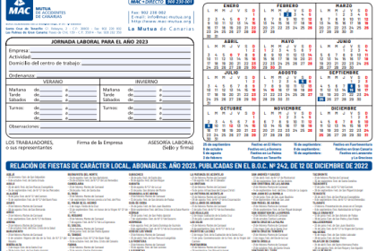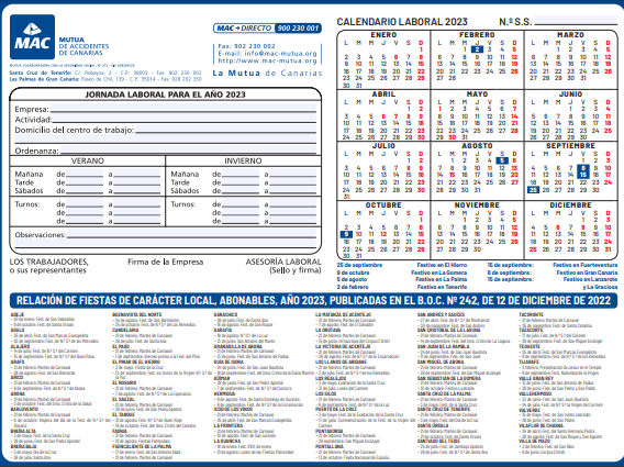 MAC ya ha enviado a sus empresas asociadas y colaboradores el calendario laboral del Archipiélago para 2023 y, de igual forma, ya figura en la página web de nuestra entidad (www.mac-mutua.org). Como ya ha ocurrido otros años, MAC desdobla el calendario en dos, abarcando las dos provincias canarias y recogiendo todos y cada uno de los días festivos de los 88 municipios del Archipiélago.
