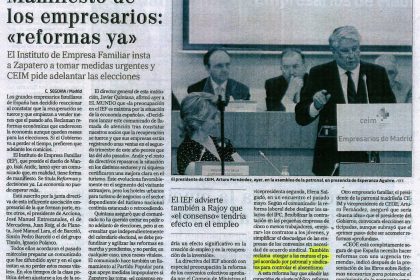 El Instituto de Empresa Familiar insta a Zapatero a tomar medidas urgentes y CEIM pide adelantar las elecciones.
