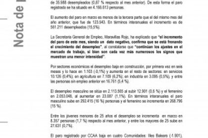 El desempleo masculino se situa en 2.113.565 al subir 12.901 (0,6 %) y el femenino en 2.053.048, al aumentar en 23.087 (1,1%). En terminos interanuales el paro masculino sube en 292.415 (16 %) personas y el femenino se incrementa en 268.796 (15 %).