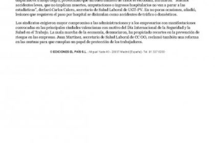 Los sindicatos exigieron mayor compromiso a las administraciones y a los empresarios con manifestaciones convocadas en las principales ciudades valencianas con motivo del Dia Internacional de la Seguridad y la Salud en el Trabajo. La mala marcha de la economia, denunciaron, ha propiciado recortes en la prevencion de riesgos en las empresas. Juan Martinez, secretario de Salud Laboral de CC OO, reclamo tambien una reforma en las mutuas para que cumplan un papel de proteccion de los trabajadores.