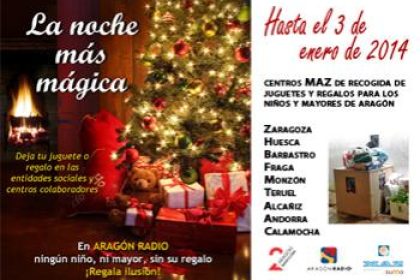 El Hospital de Zaragoza, la Sede Social y los centros asistenciales de la entidad en Huesca, Barbastro, Fraga, Monzon, Teruel, Andorra, Alcaniz y Calamocha, seran algunos de los escenarios de esta campana solidaria organizada por Aragon Radio para recoger juguetes para ninos y ancianos desfavorecidos.