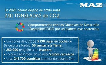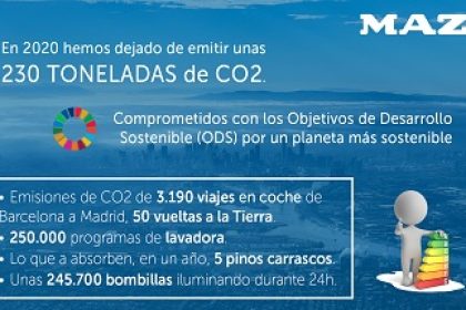 Además, esta reducción del pasado año con respecto a 2019 supone que MAZ ha dejado de emitir a la atmósfera aproximadamente 230 toneladas de dióxido de carbono (CO2). “Esta cantidad de emisión de CO2 es equivalente a 3.190 viajes en coche de Barcelona a Madrid, 50 vueltas a la Tierra, unas 245.700 bombillas iluminando durante las 24 horas del día y la cantidad que absorben, a lo largo de un año, casi cinco pinos carrascos, uno de los árboles más eficientes en la absorción de dicho gas”, remarca Ruiz.