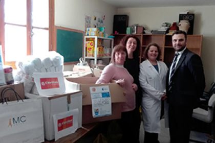 El acto de entrega de la donacion al Banco de Alimentos conto con la presencia de la Concejal de Asuntos Sociales del Ayuntamiento de Casarrubuelos, M del Carmen Sierra; la representante de Caritas en dicha poblacion, Macarena Vara; Jose Antonio Perez, responsable de MC MUTUAL en Humanes y Fuenlabrada; y Cristina Fernandez, DUE de MC MUTUAL en Fuenlabrada.