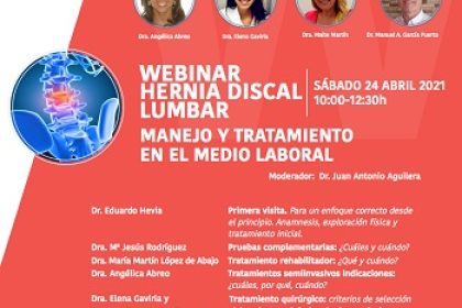 Se trata de un webinario dirigido a médicos asistenciales y del trabajo, traumatólogos, profesionales de la enfermería u otros sanitarios implicados en el tratamiento de la hernia discal lumbar. El simposio analizará todos los pasos que se incluyen en el manejo y tratamiento de la hernia discal lumbar en el mundo laboral, desde la historia clínica en la primera visita, las pruebas complementarias y el momento de pedirlas, el tratamiento rehabilitador, semiinvasivo (infiltraciones) y finalmente la intervención quirúrgica.
