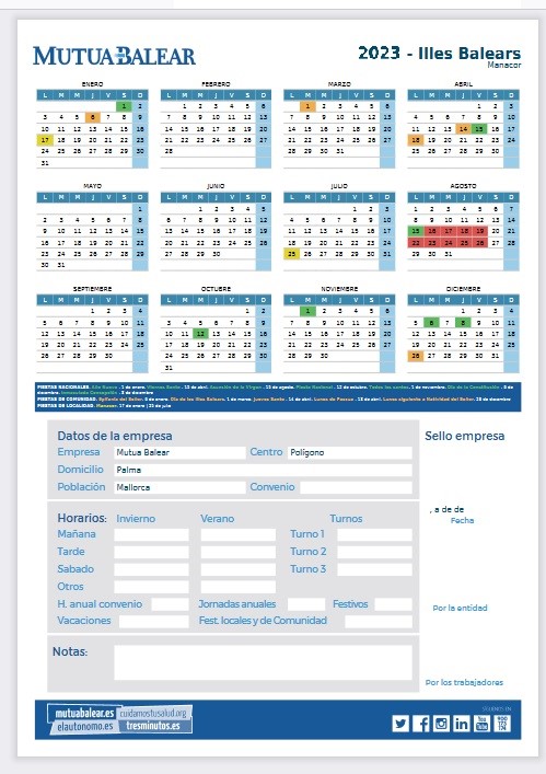 Mutua Balear ha actualizado y mejorado su herramienta web para crear, personalizar y descargar los calendarios laborales del año 2023. De esta forma, todas las empresas asociadas a la entidad, gestorías colaboradoras o aquellos mutualistas que lo necesiten pueden descargar desde ya mismo el calendario laboral del próximo año y ajustarlo a sus necesidades: www.mutuabalear.es/calendarios.
