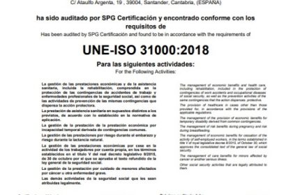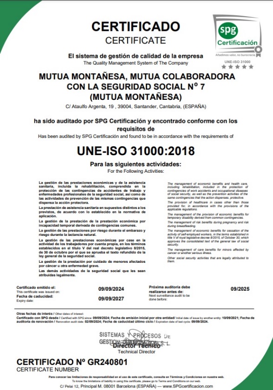 Mutua Montañesa ha revalidado la certificación UNE-ISO 31000:2018 de Gestión del Riesgo de la mano de SPG Certificación, que, tras realizar la auditoría correspondiente, avala el cumplimiento de la entidad a la hora de identificar, gestionar y controlar los riesgos que puedan interferir en la prestación de sus servicios, cumpliendo los principios que establece la norma.
