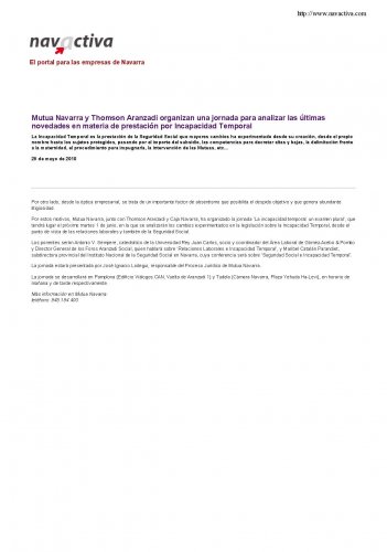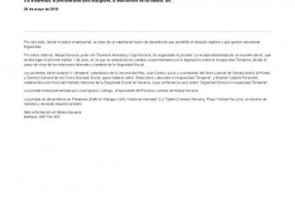 Por estos motivos, Mutua Navarra, junto con Thomson Aranzadi y Caja Navarra, ha organizado la jornada ‘La incapacidad temporal: un examen plural’, que tendrá lugar el próximo martes 1 de junio, en la que se analizarán los cambios experimentados en la legislación sobre la Incapacidad Temporal, desde el punto de vista de las relaciones laborales y también de la Seguridad Social.