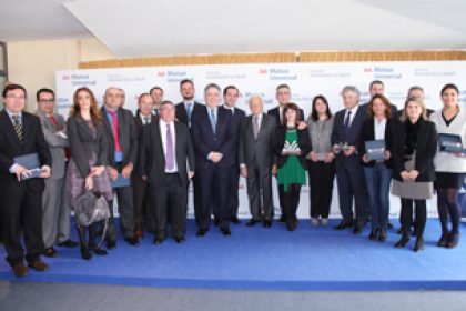 – Fotografia ganadores I edicion: De izquierda a derecha: Juan Antonio Guell Ubillos, Director Gerente de Mutua Universal; Belen Sagredo y Ana Maria Becerril, Departamento de Prevencion de Gonvarri; Tomas Burgos, Secretario de Estado de Seguridad Social; Jose Ignacio Pascual Santos, Responsable Servicio de Prevencion; Cesar Pinilla, Responsable de RR.HH de Gonvarri; Juan Echeverria Puig, Presidente de Mutua Universal.
