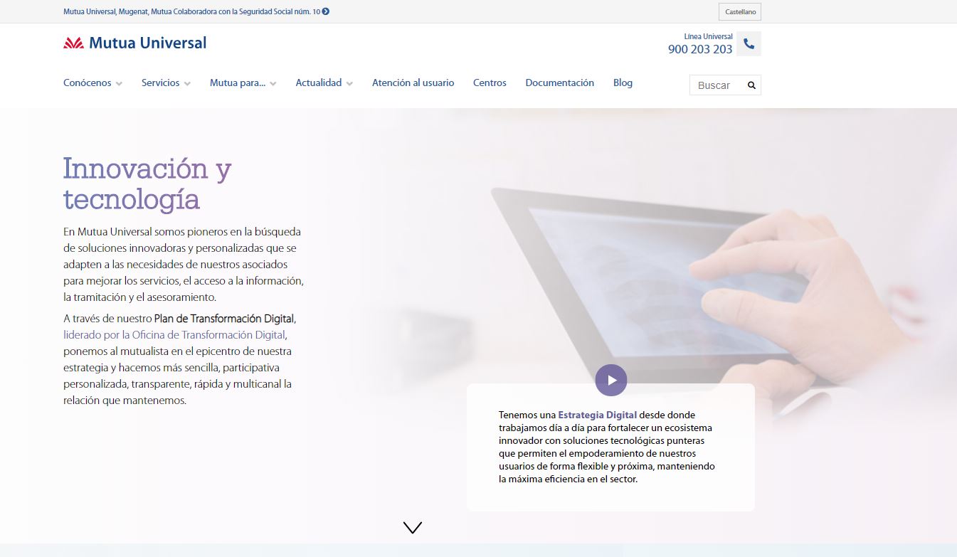 Con el objetivo de visibilizar las principales soluciones desarrolladas por Mutua Universal hasta la fecha, la página web pública de la Entidad ha integrado una landing page dedicada a la innovación tecnológica y que agrupa todas las herramientas y servicios digitales que se ofrecen actualmente a los asociados, divididos en diferentes bloques: